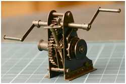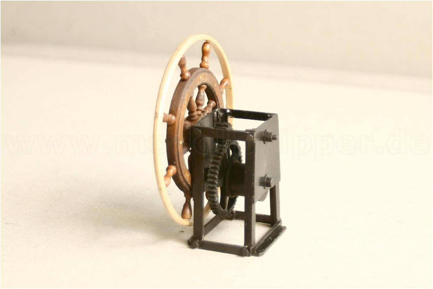 Eine aus Messing gebaute Ankerwinde vor und nach der Behandlung mit Beize, sowie das Getriebe eines Steuerrades.