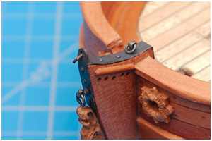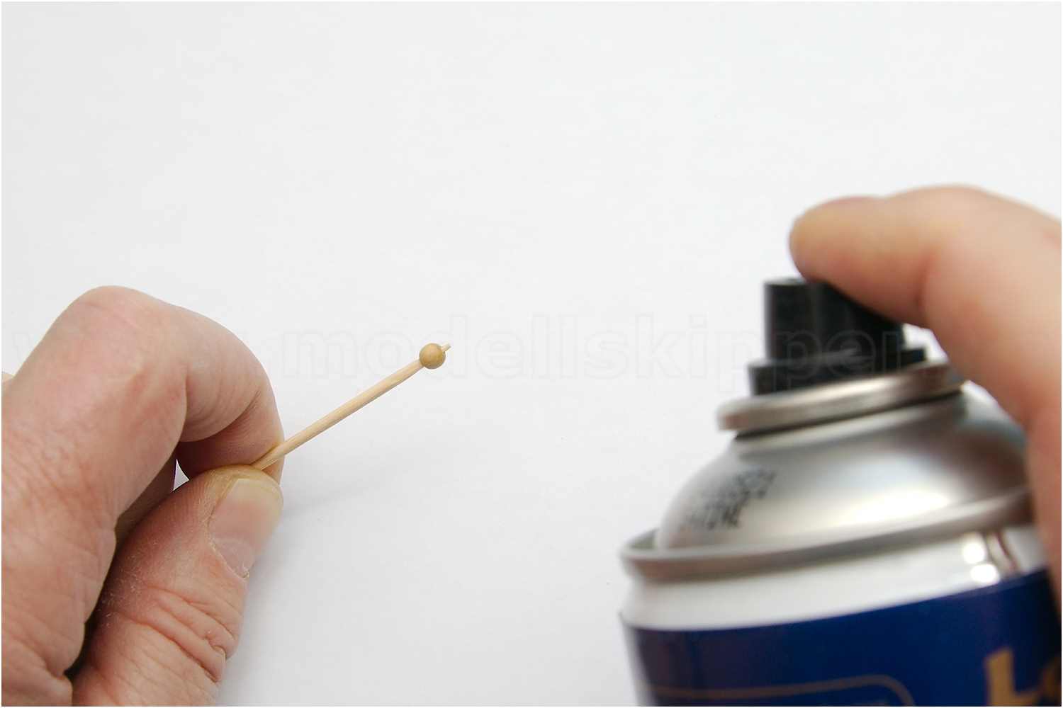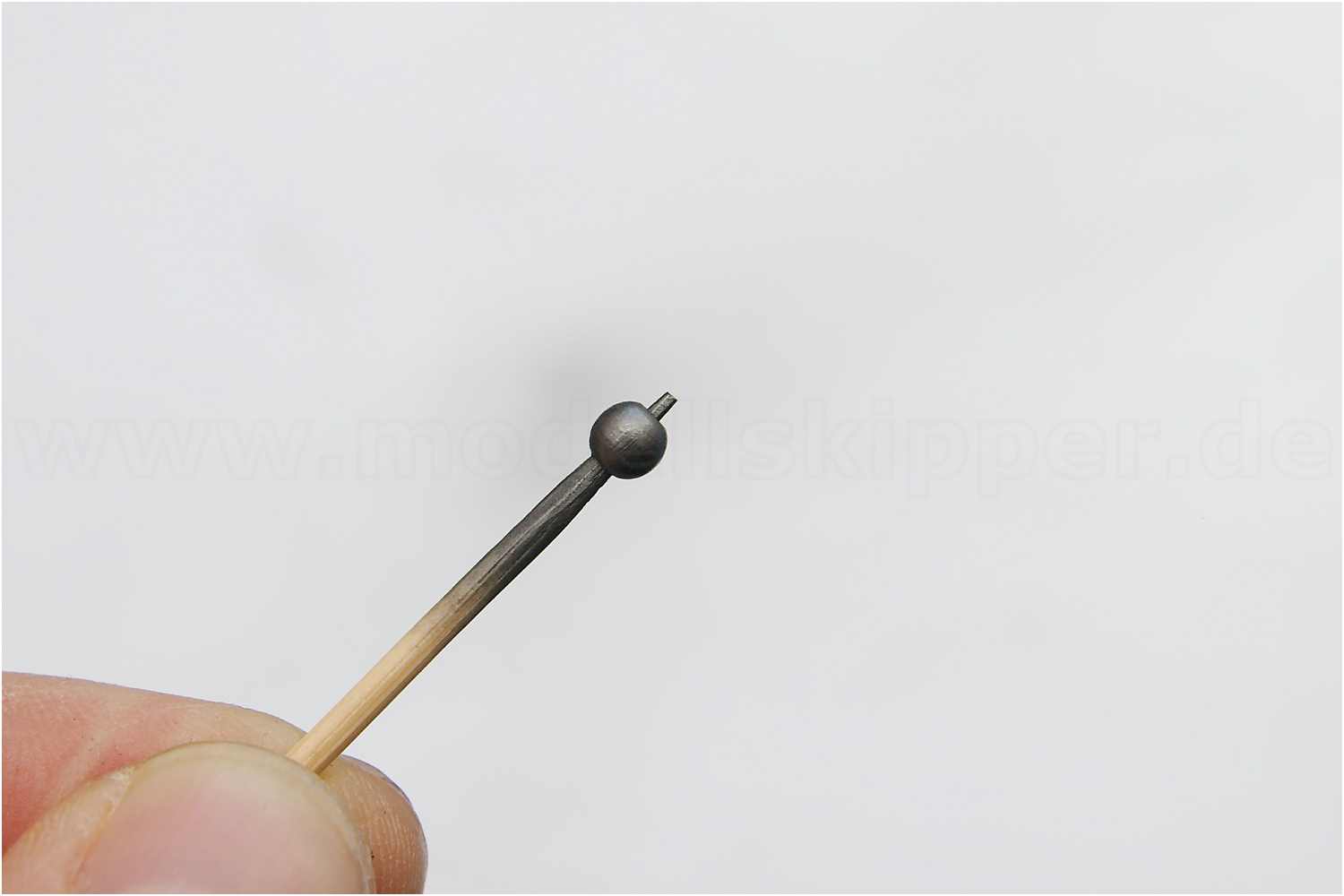 An einer Ruderpinne ist am Ende des Handgriffs eine Kugel aufgesetzt. Während der Beschlag aus Messing gefertigt und problemlos brüniert werden konnte, ist diese Kugel aus Holz und soll auch ein metallisches Aussehen erhalten.