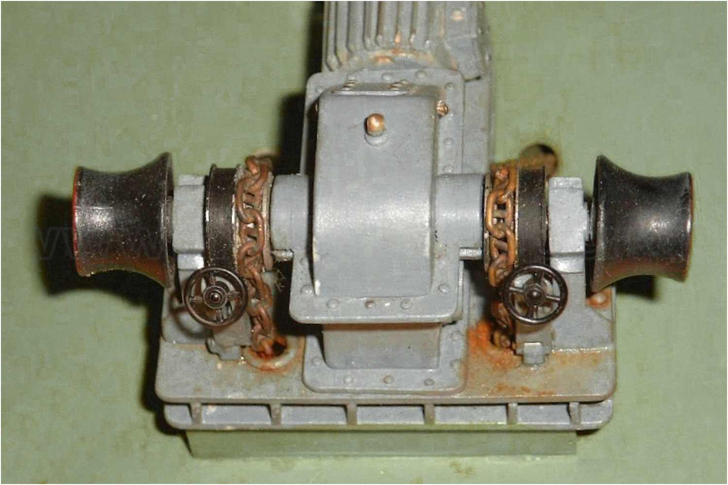 Ankerketten aus messing lassen sich gut beizen, wie hier bei einer funktionstüchtigen Ankerwinde. Durch die Benutzung reibt sich die Brünierung mit der Zeit ab und bildet sogar ''echten'' Rost.