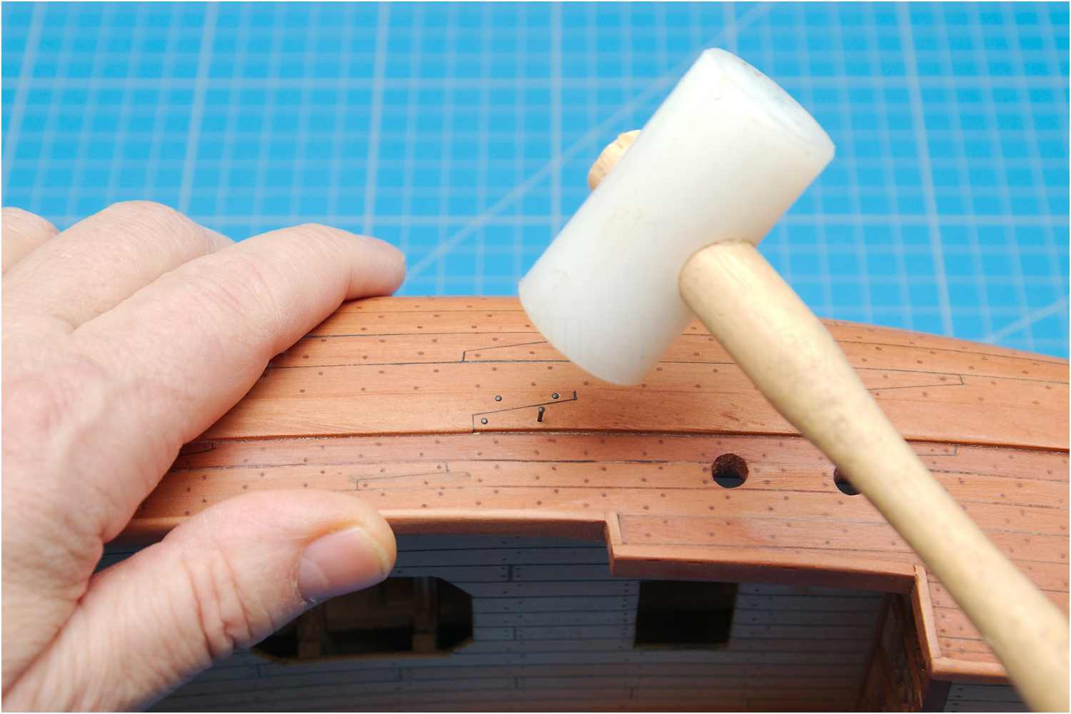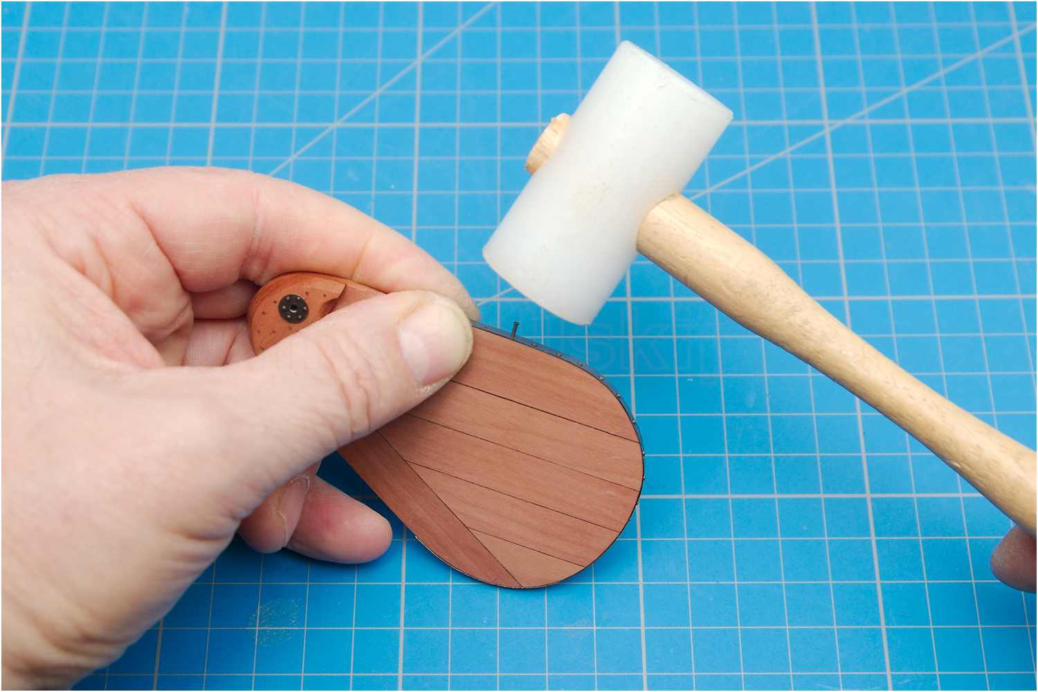 Gerade bei brünierten Messingbolzen oder Stiften bleibt so die Brünierung erhalten, die sonst mit einem Stahlkopfhammer ggf. wieder entfernt wird.