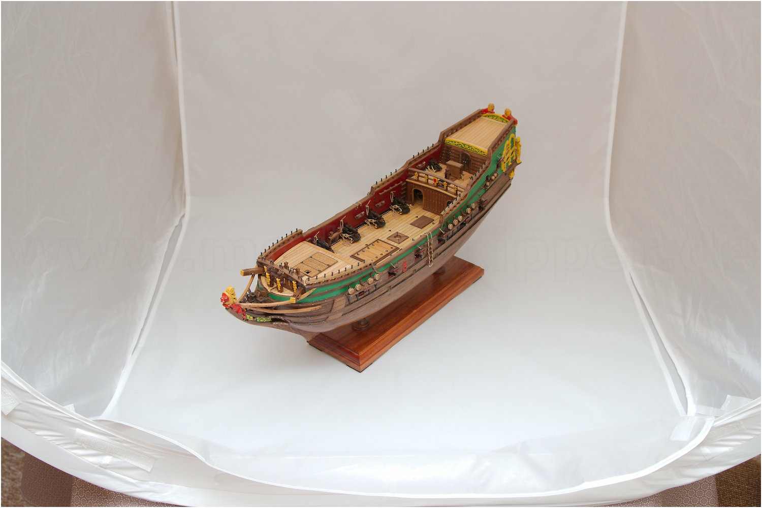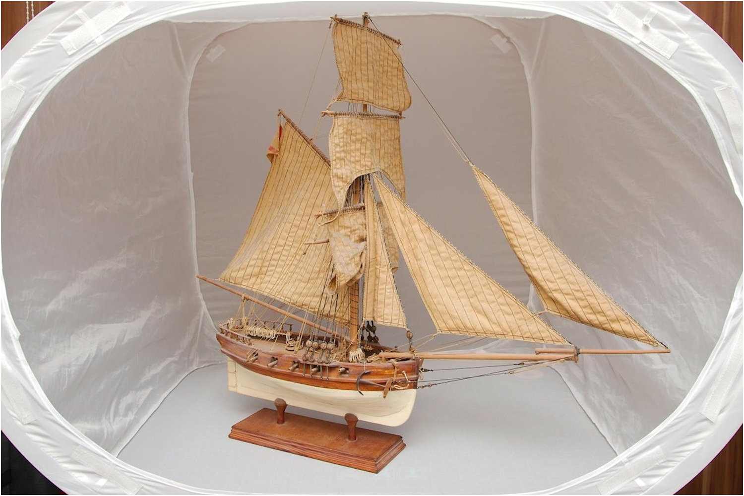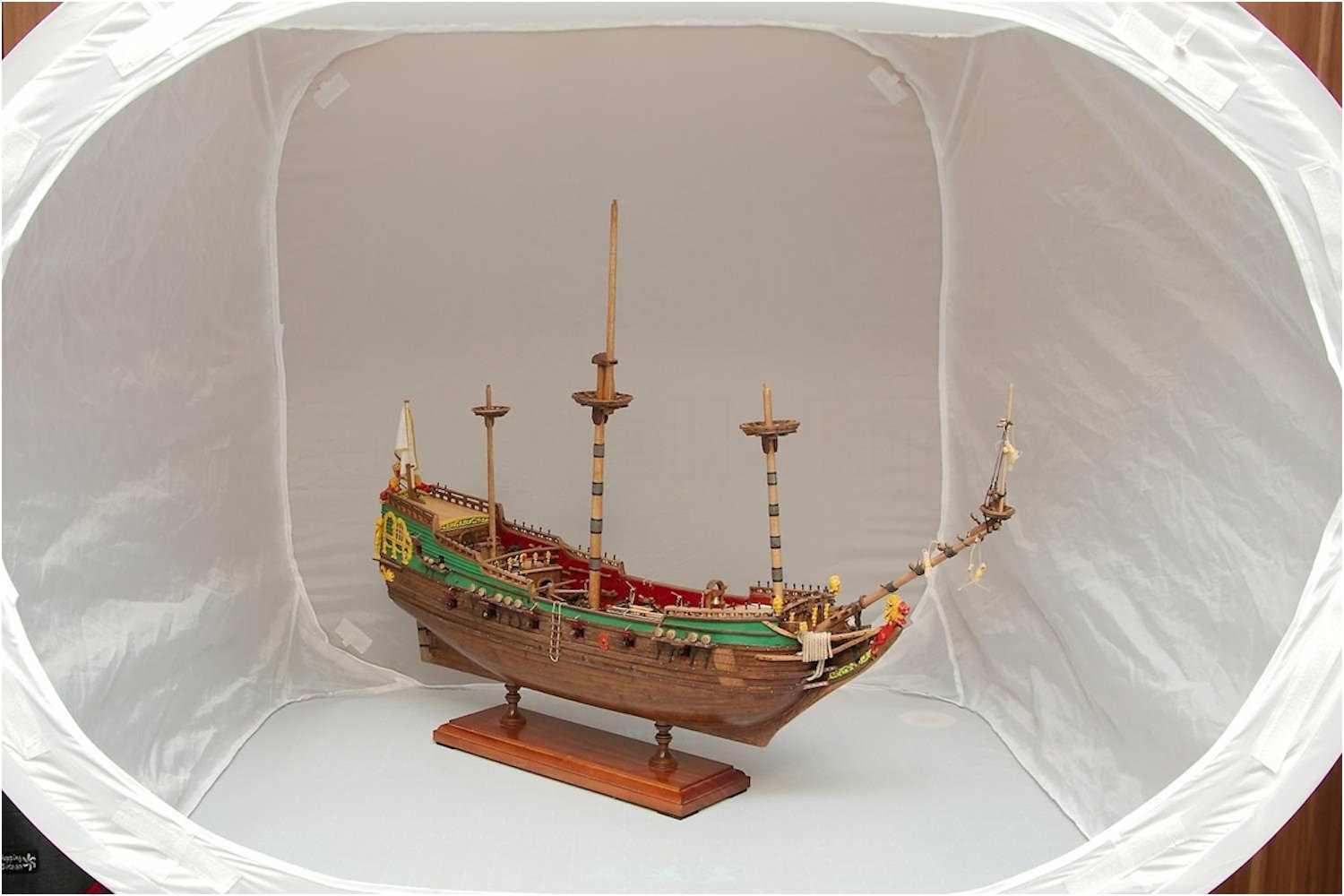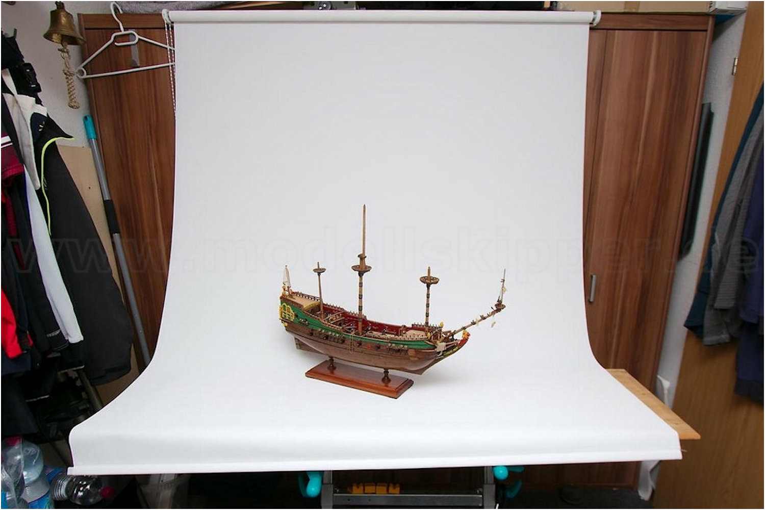 Möchte ich vor einem neutralen Hintergrund fotografieren, habe ich lange Zeit einen sogenannten Lichtwürfel mit den Abmessungen 80x80 cm genutzt, was mit fortschreitenden Bauphasen eines Modells dann allerdings schon recht knapp bemessen sein kann. Ab einer gewissen Modellgröße muss dann aufwändig retuschiert werden.