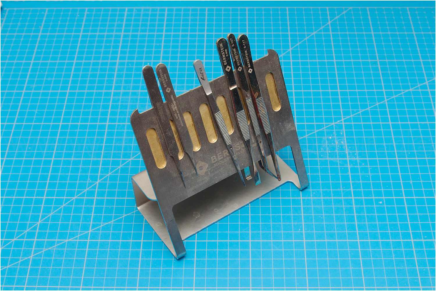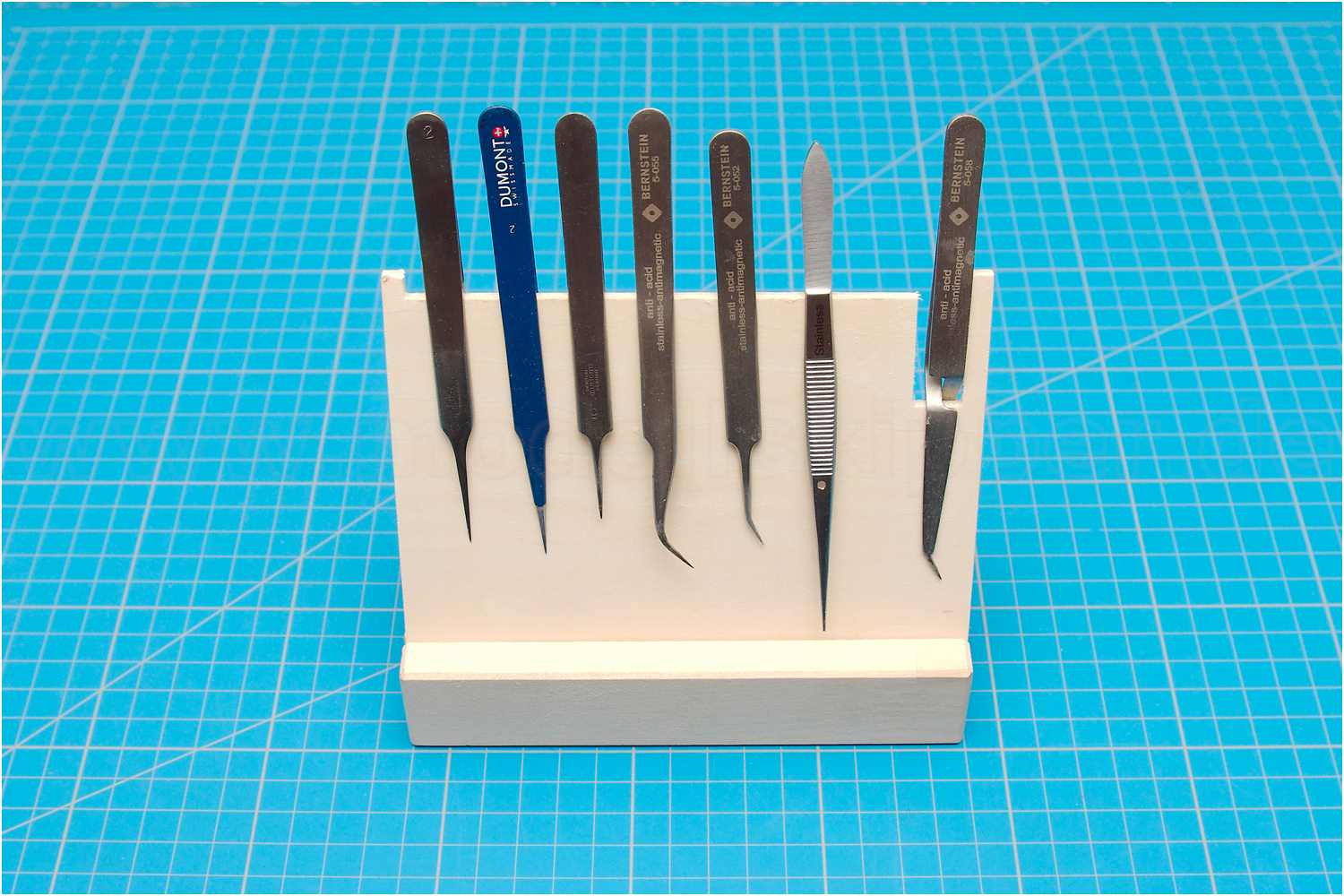 Rechts habe ich eine Aussparung für eine Klemmpinzette eingearbeitet, da diese beim alten Halter immer recht weit über die anderen Pinzette hinausragte.