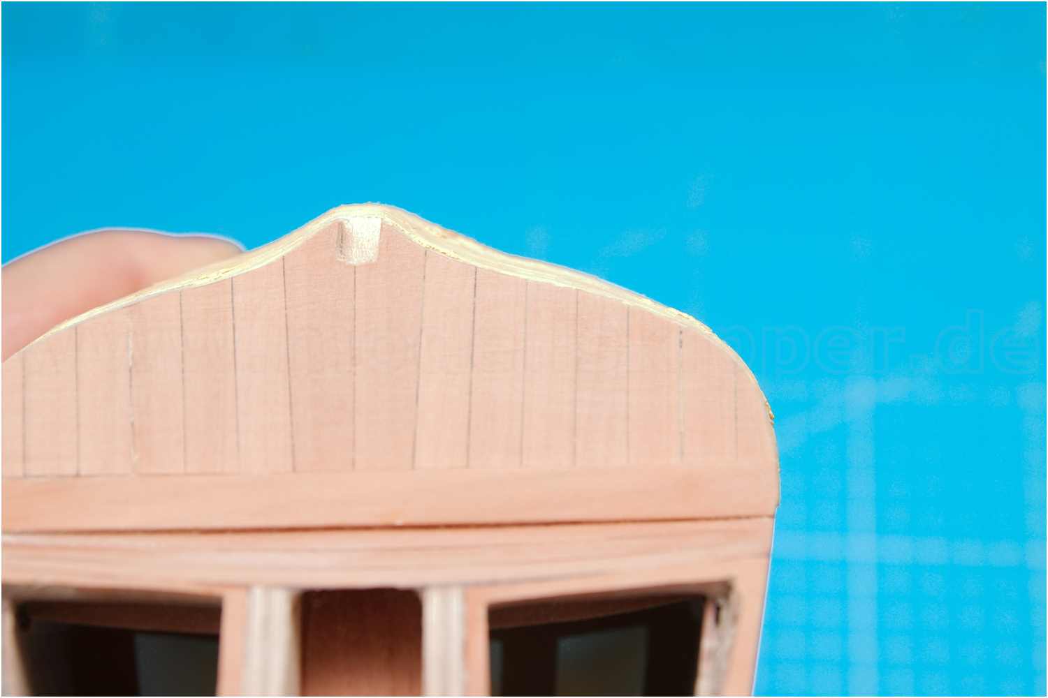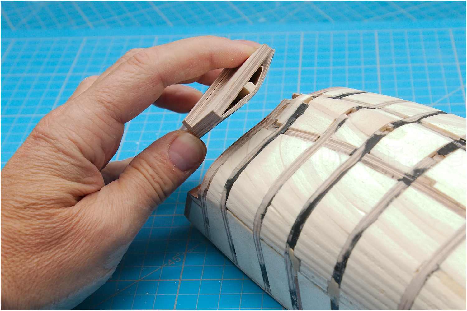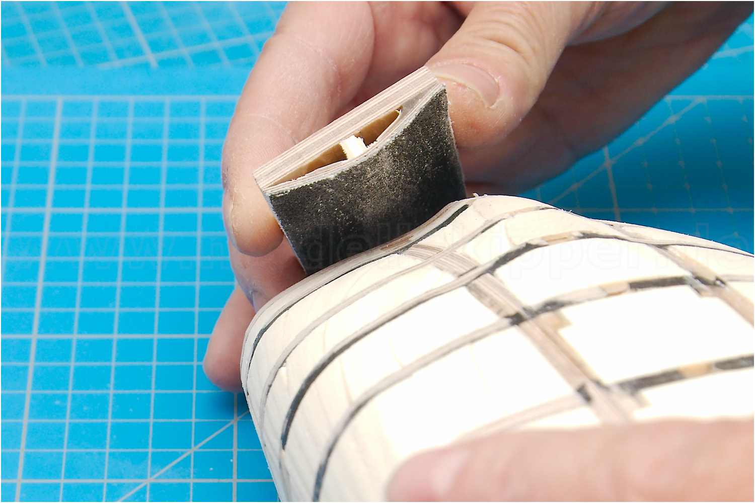 Während sich äußere konvexe Rundungen eines Rumpfes mit einem flachen Schleifbrett recht einfach bearbeiten lassen, nutze ich für konkave Formen im Heckbereich ein gebogenes Schleifbrettchen.