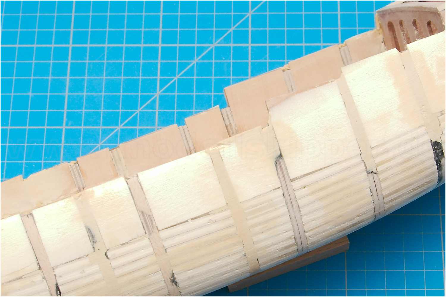 Bei der Erstbeplankung eines Modellrumpfes arbeitet man immer mit etwas Übermaß, das beim späteren Schleifen wieder entfernt wird. Auch bei der Oberkante des Schanzkleides gibt man ausreichend Material zu, um genug Spielraum bei der Endbearbeitung zu haben.