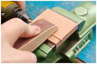 Nachdem das Holz abgerundet wurde, legt man sie in die zweite Nut, um die Oberseite mit einem Schleifbrettchen abzuschleifen und erhält so ein sauberes Halbprofil.