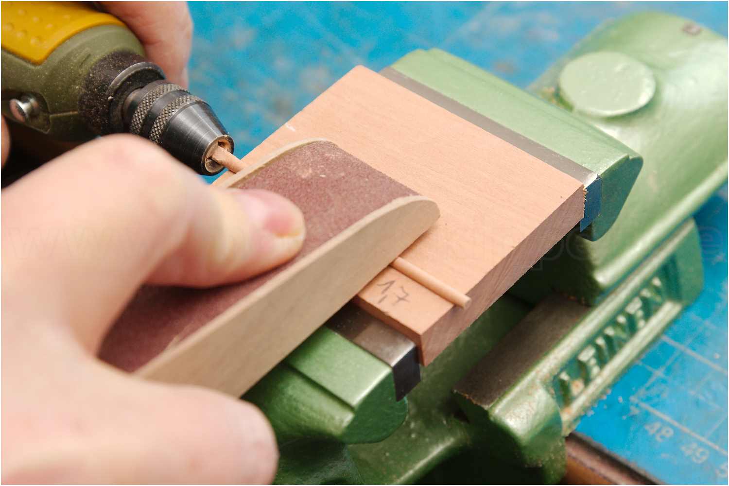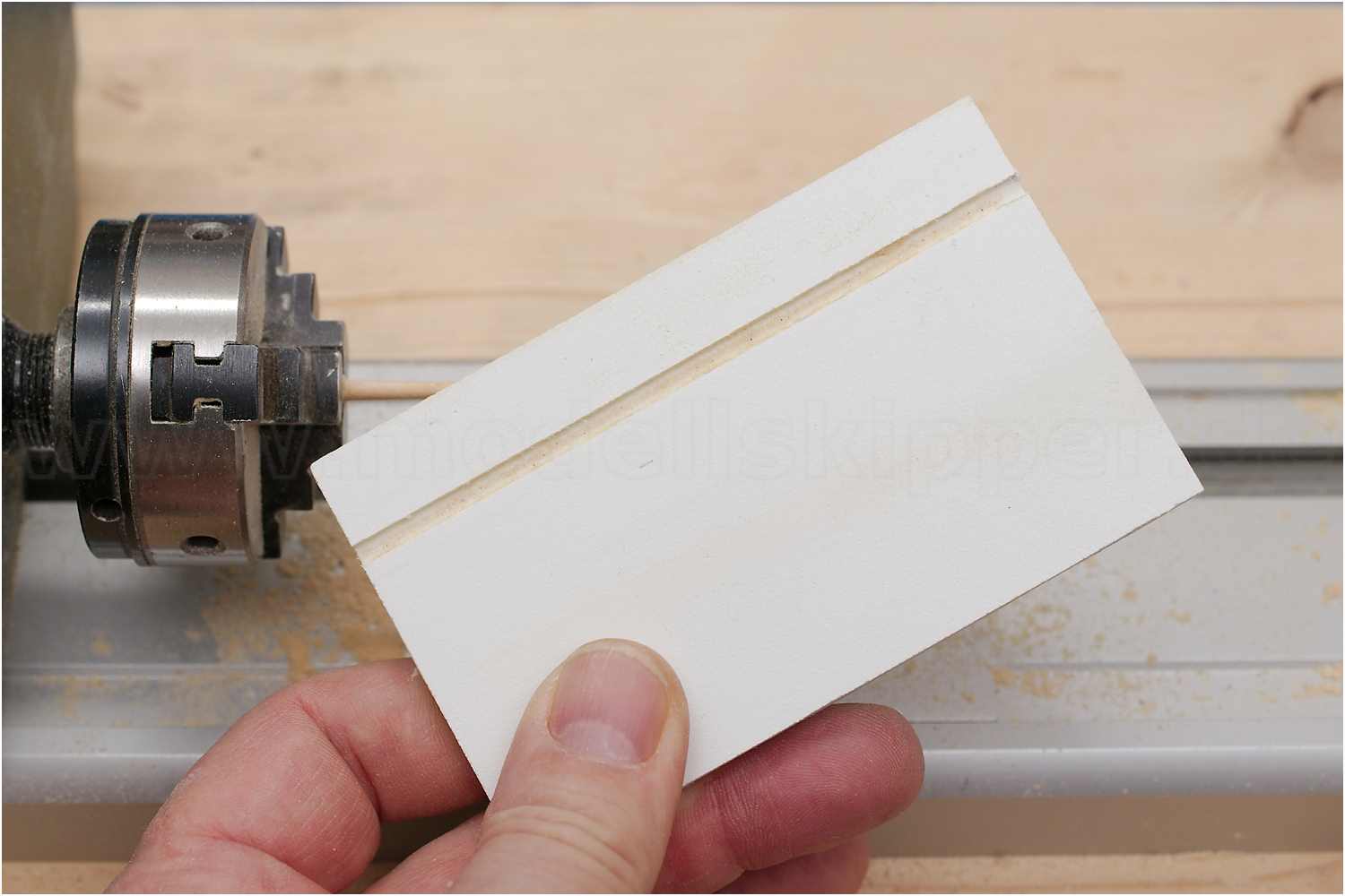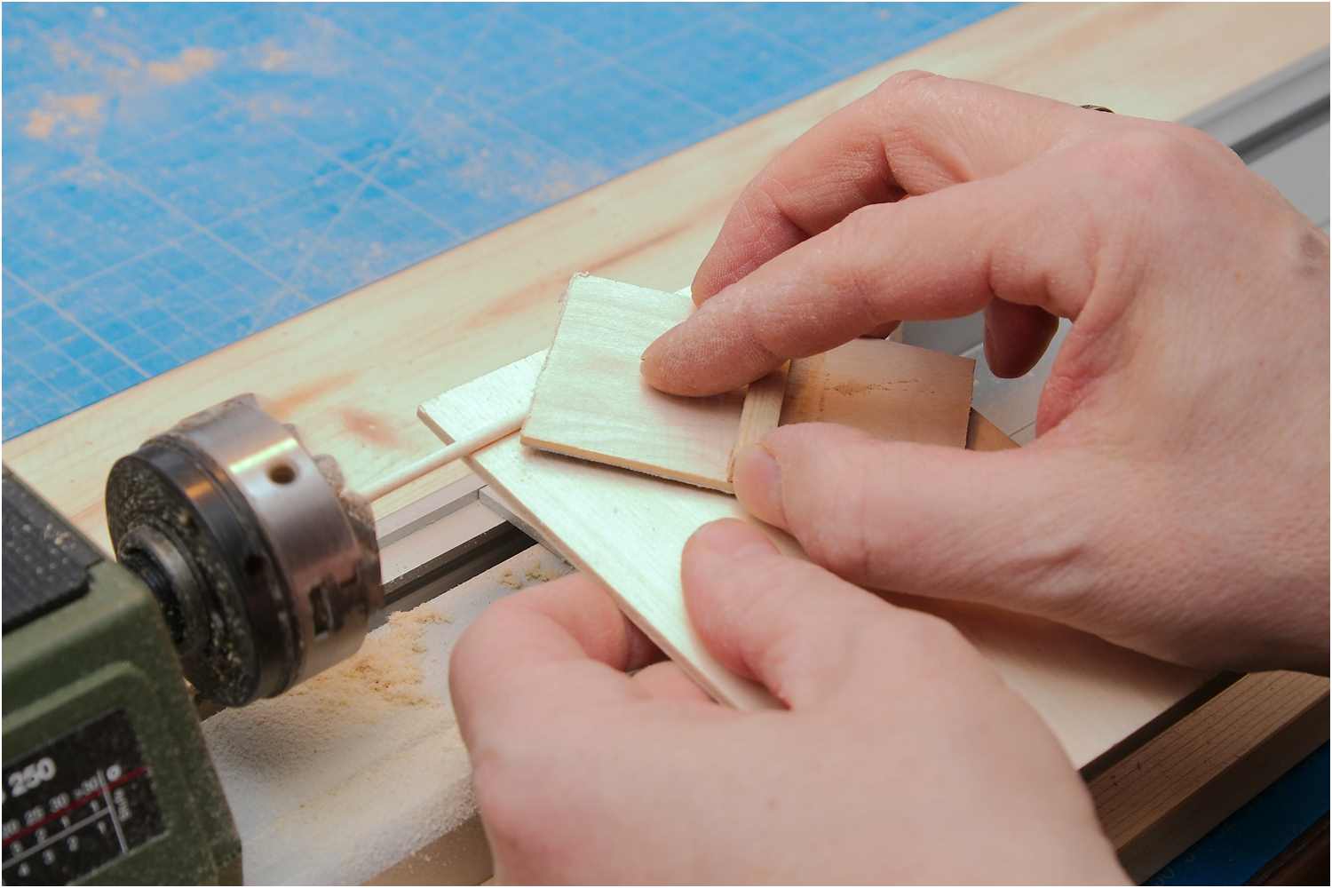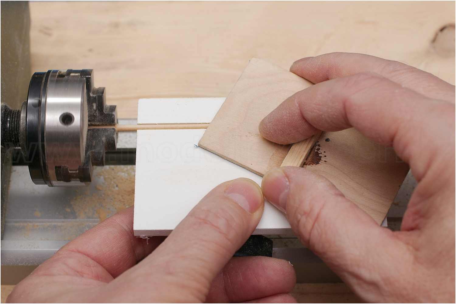 Dazu beklebt man ein Stück Sperrholz mit Schleifleinen, legt ein weiteres Sperrholzbrettchen auf die Werkzeugführung der Drechselbank und kann so mit dem Schleifbrett das Rundholz sehr dünn abschleifen, ohne dass es bricht.