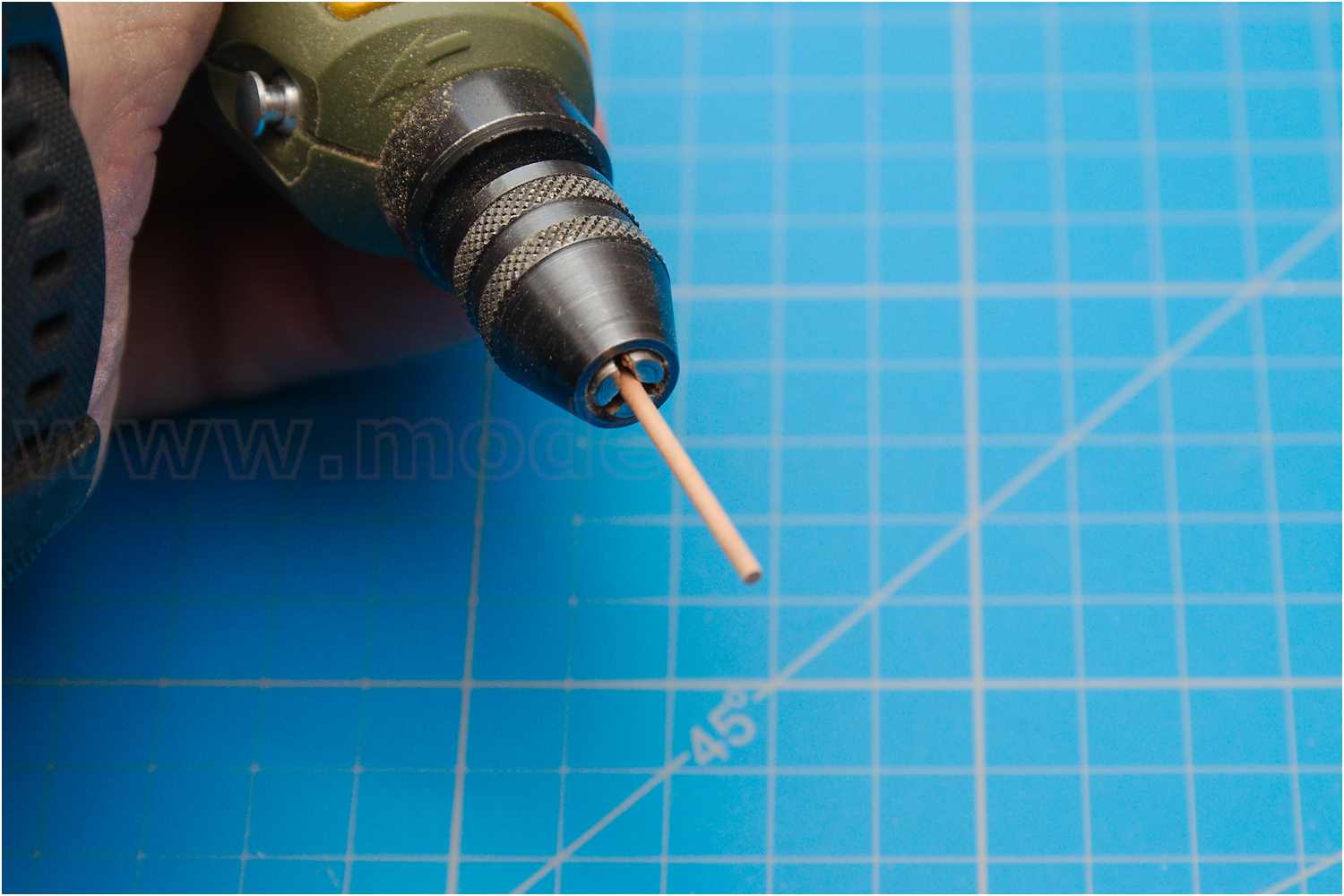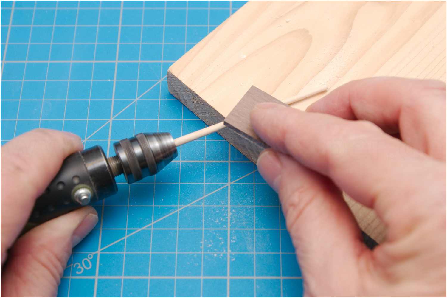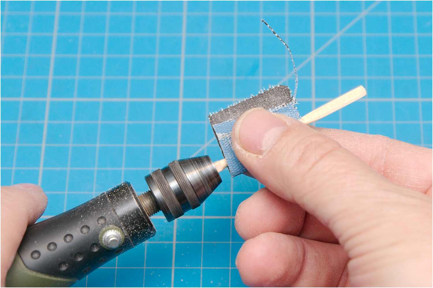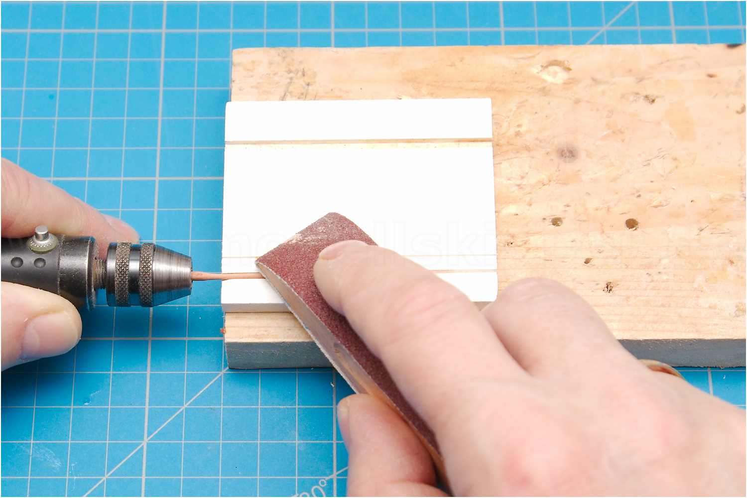Dazu beklebt man ein Stück Sperrholz mit Schleifleinen, legt ein weiteres Sperrholzbrettchen auf die Werkzeugführung der Drechselbank und kann so mit dem Schleifbrett das Rundholz sehr dünn abschleifen, ohne dass es bricht.