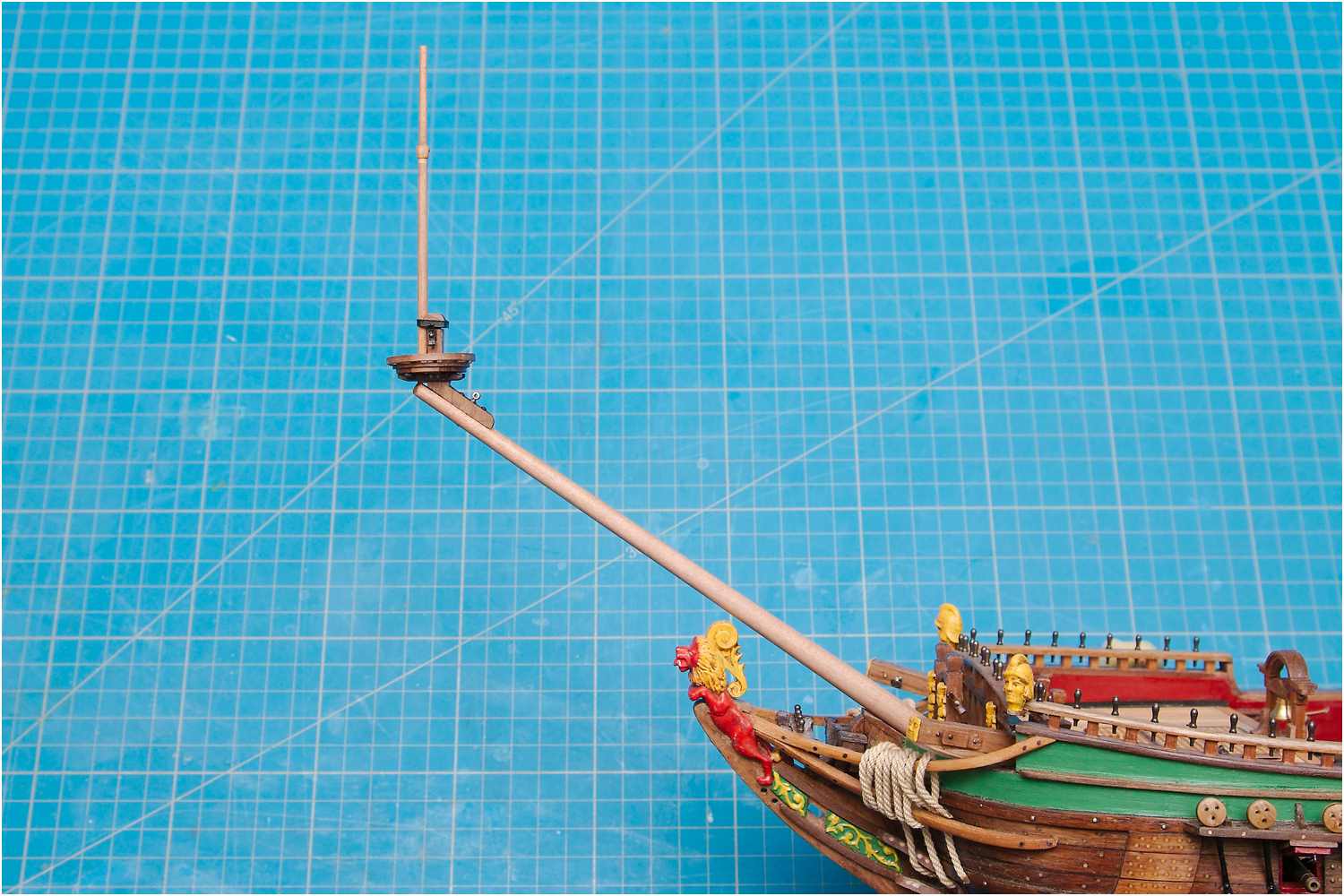 Während sich z.B. ein Bugspriet noch gut mit Drechseleisen bearbeiten lässt, kann eine Fahnenstange schon recht dünn sein.