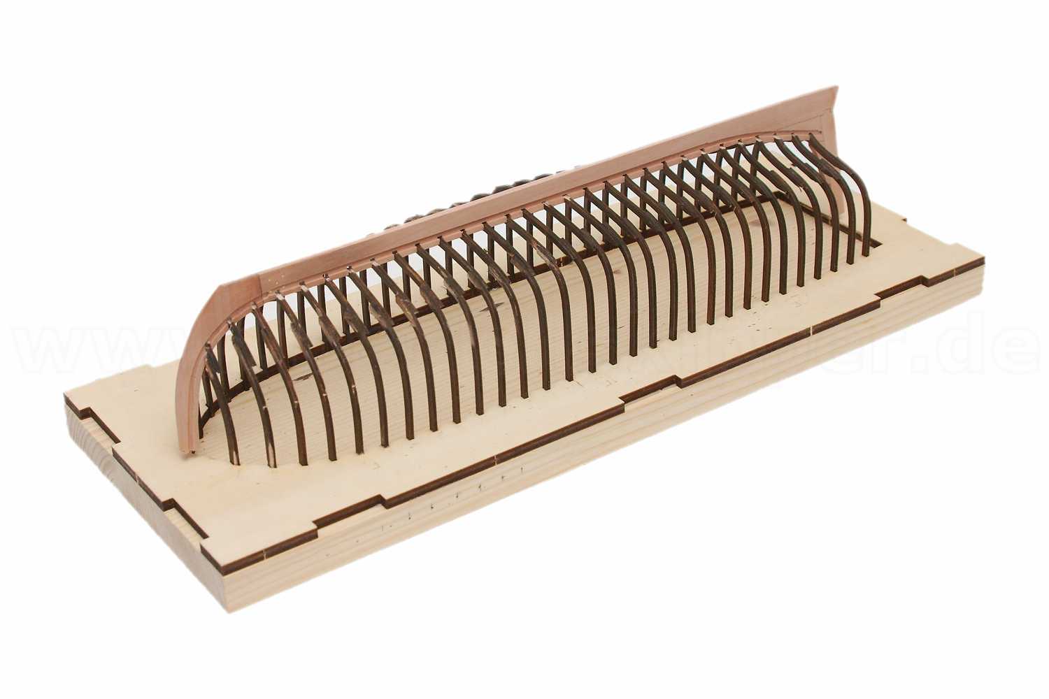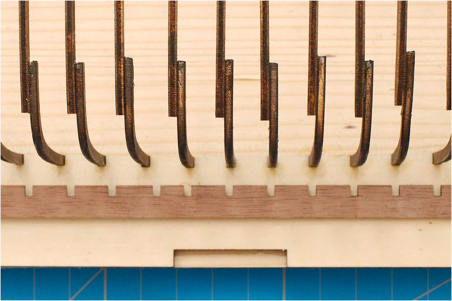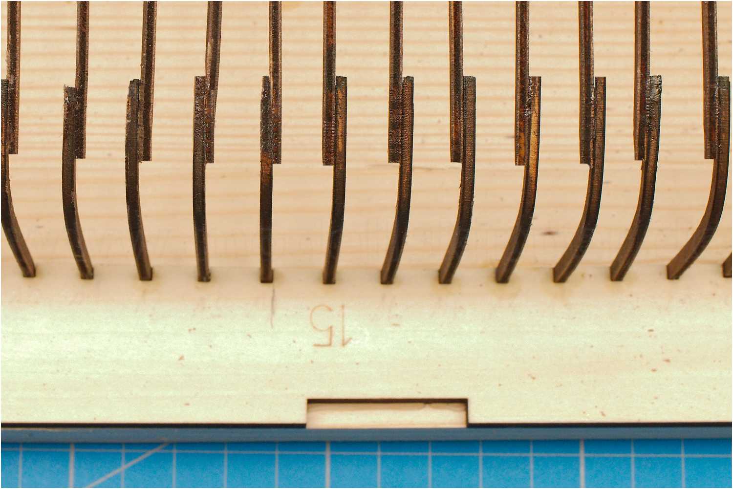 Nach dem Zusammenkleben der Einzeltzeile wurde mittels des gelaserten Kiels aus dem Bausatz als Schablone die Spantaufnahmen gefräst.