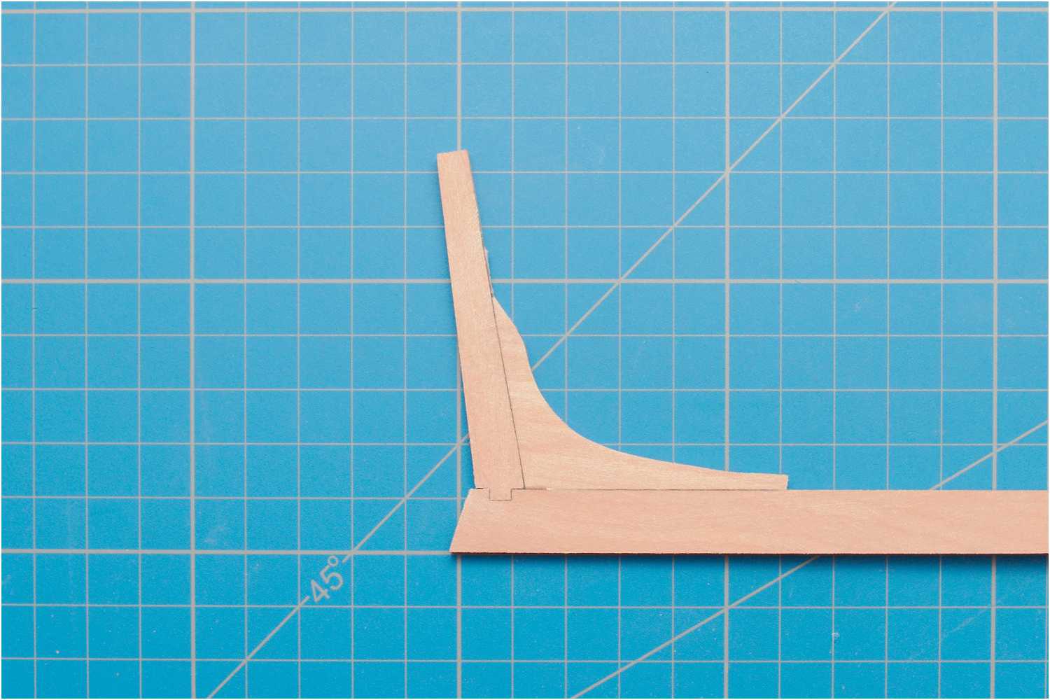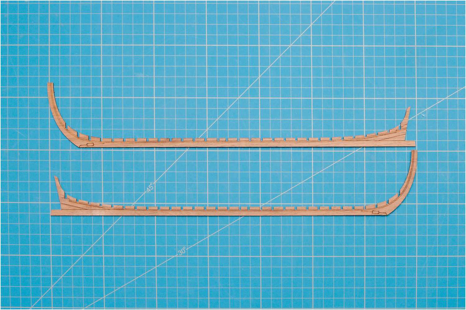 Der Kiel aus dem Baukasten müsste aus zwei Hälften zusammengeklebt werden und würde so im Sichtbereich die geklebten Lagen zeigen.