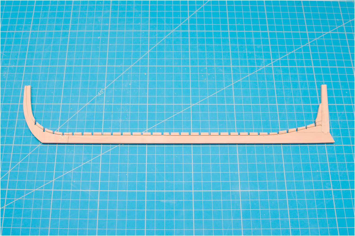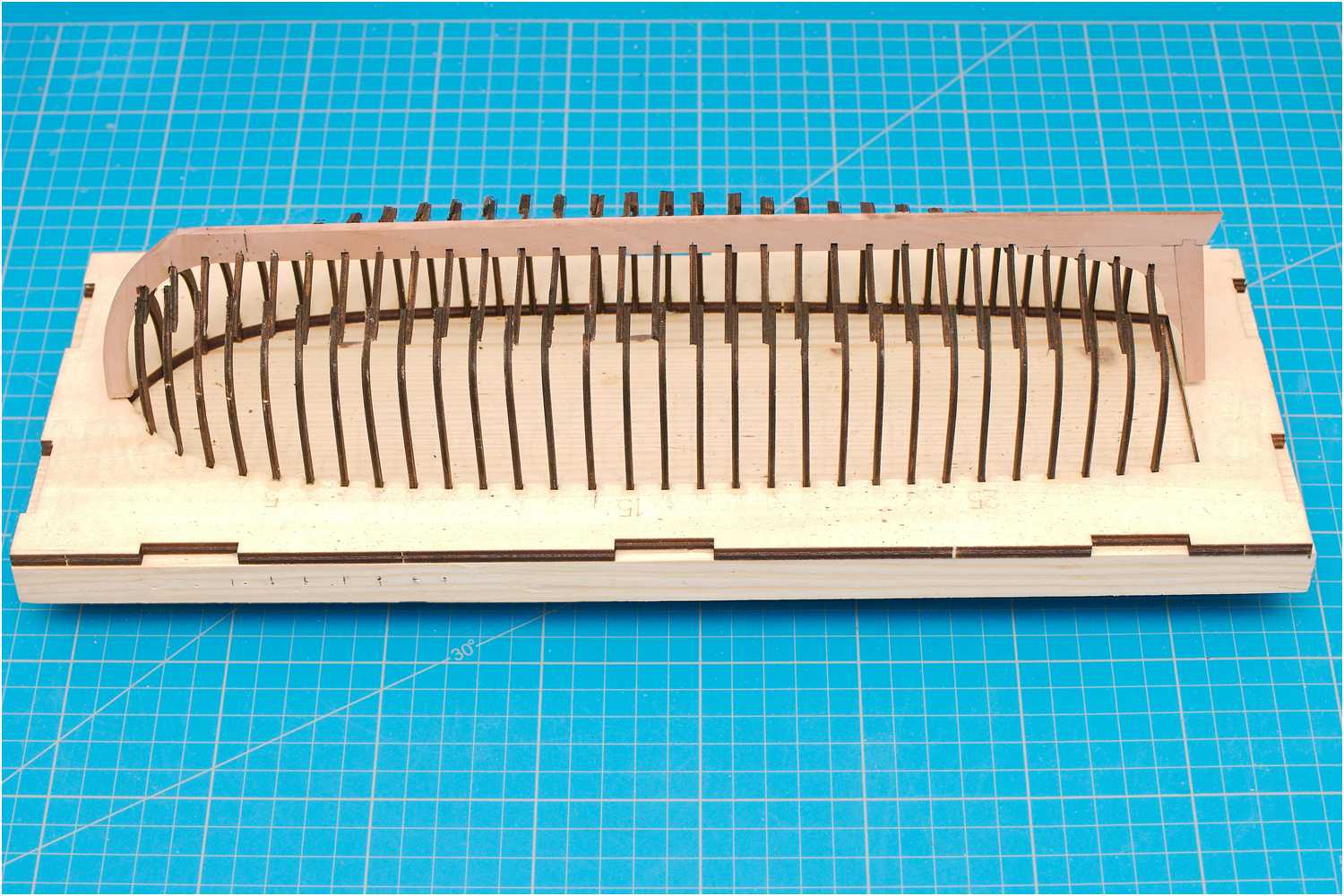 Nicht ganz klar war beim Aufstellen der Spanten, nach welcher Seite die Bodenwrange zeigen sollen. Von vorn bis zur Hälfte des Rumpfes zeigen sie nach hinten, ab der Hälfte bis zum Heck nach vorn. Auch aus den Planzeichnungen war das nicht zu entnehmen.