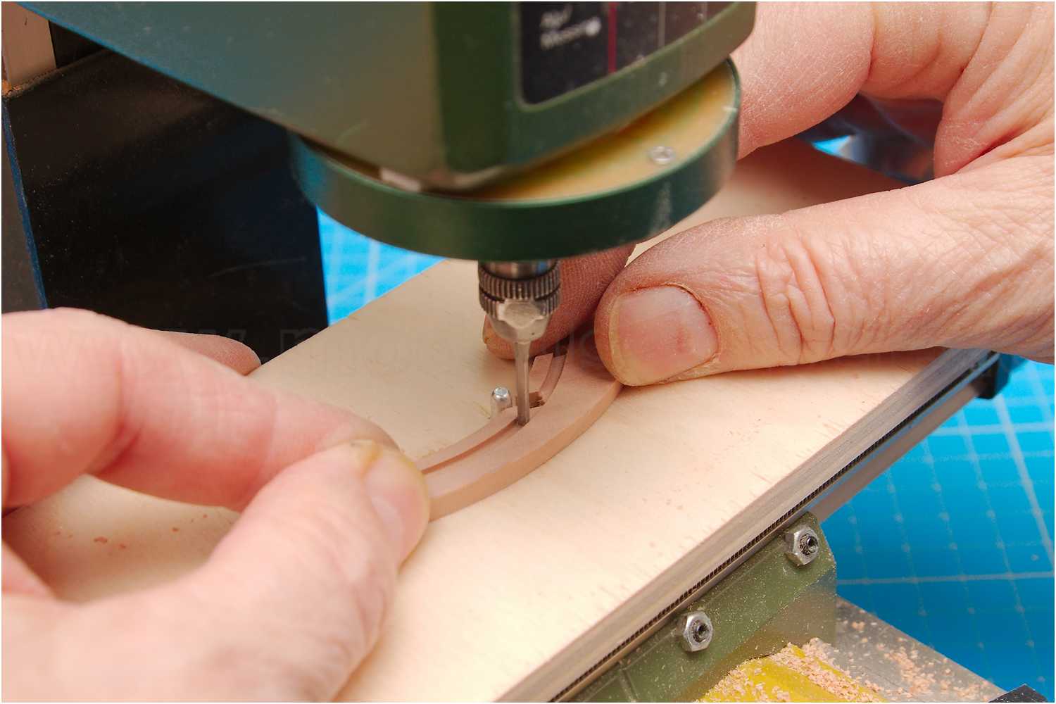 Beidseitig in die Oberseiten, auf den Frästisch aufgespant, gebogener Vordersteven und achteres Totholz mitels Stiftanschlag.